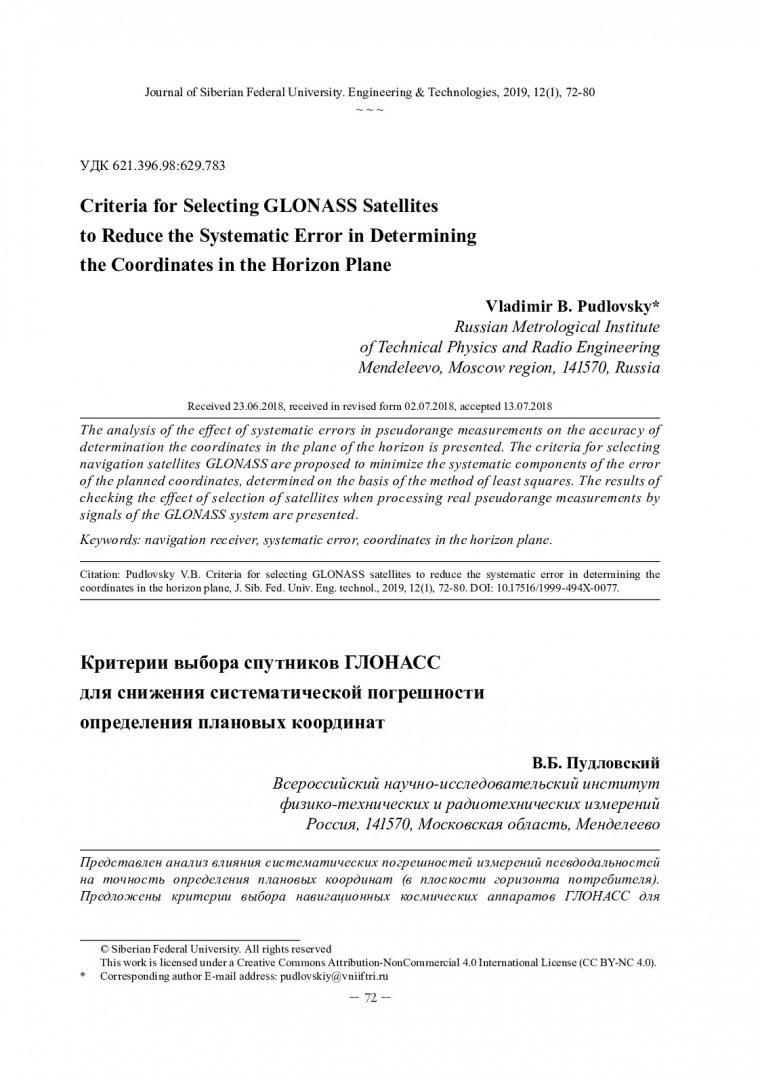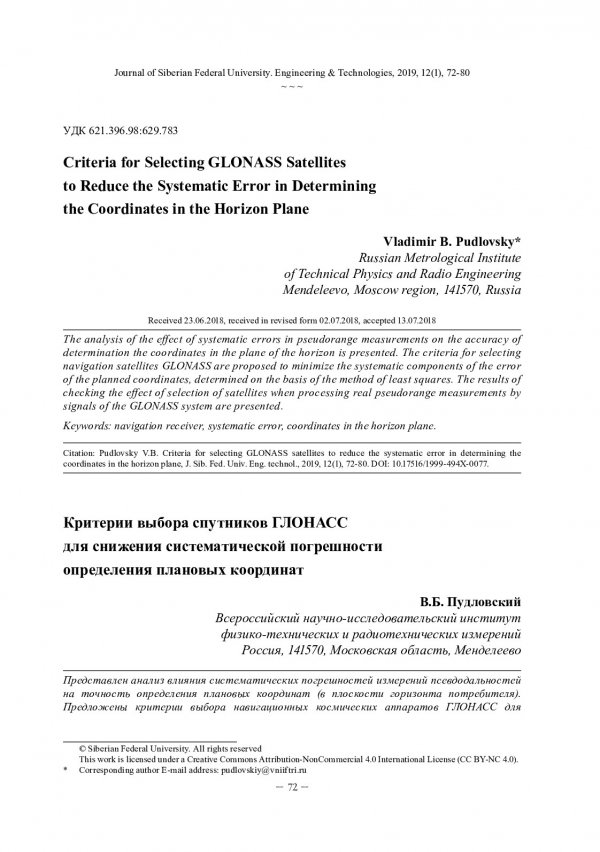 Библиографическое описание:Pudlovsky, Vladimir. Criteria for Selecting GLONASS Satellites to Reduce the Systematic Error in Determining the Coordinates in the Horizon Plane = Критерии выбора спутников ГЛОНАСС для снижения систематической погрешности определения плановых координат / V. B. Pudlovsky. - Текст : непосредственный // Журнал Сибирского федерального университета. Техника и технологии. - 2019. - Т. 12, № 1. - С. 72-80 : рис. - Библиогр.: с. 80. - ISSN 1999-494X.