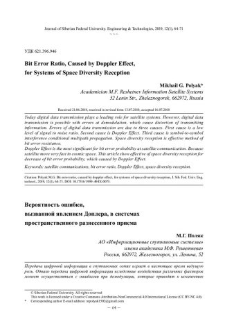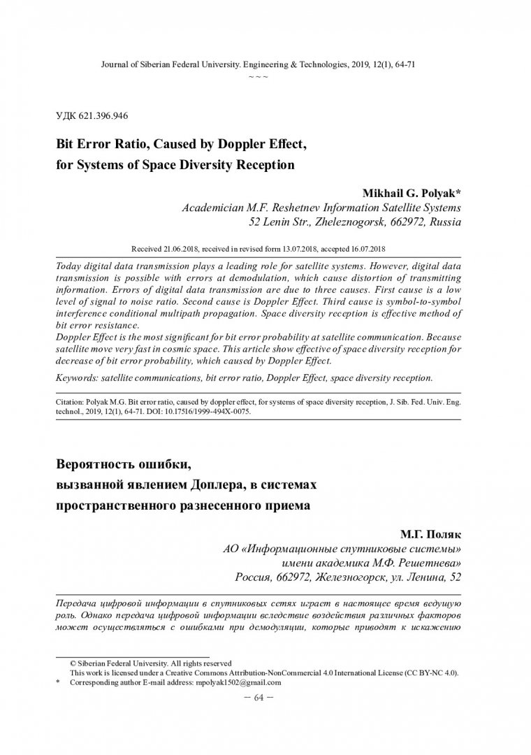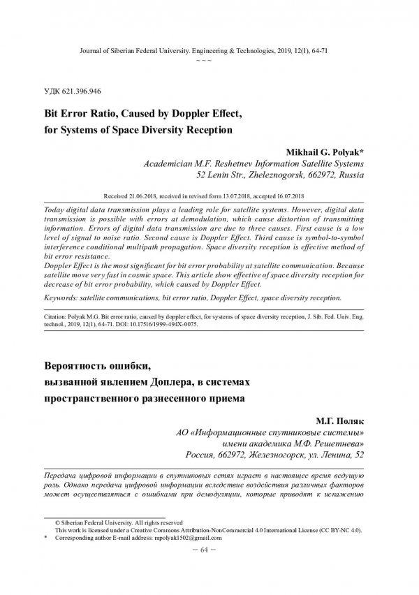 Библиографическое описание:Polyak, Mikhail. Bit Error Ratio, Caused by Doppler Effect, for Systems of Space Diversity Reception = Вероятность ошибки, вызванной явлением Доплера, в системах пространственного разнесенного приема / M. G. Polyak. - Текст : непосредственный // Журнал Сибирского федерального университета. Техника и технологии. - 2019. - Т. 12, № 1. - С. 64-71 : рис. - Библиогр.: с. 71. - ISSN 1999-494X.