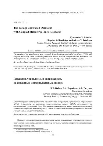 Библиографическое описание:Бабич, В. В. Генератор, управляемый напряжением, на связанных микрополосковых линиях = The Voltage Controlled Oscillator with Coupled Microstrip Lines Resonator / В. В. Бабич, Б. А. Бараболя, А. В. Петухов. - Текст : непосредственный // Журнал Сибирского федерального университета. Техника и технологии. - 2019. - Т. 12, № 3. - С. 275-283 : рис. - Библиогр.: с. 283. - ISSN 1999-494X.