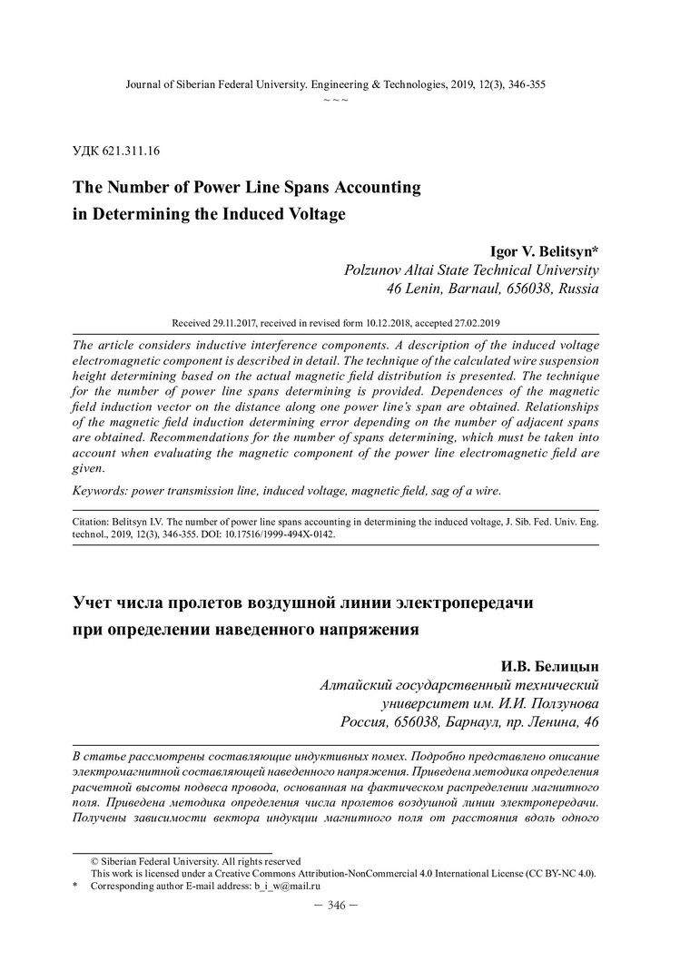 Библиографическое описание: Белицын, И. В. Учет числа пролетов воздушной линии электропередачи при определении наведенного напряжения = The Number of Power Line Spans Accounting in Determining the Induced Voltage / И. В. Белицын. - Текст : непосредственный // Журнал Сибирского федерального университета. Техника и технологии. - 2019. - Т. 12, № 3. - С. 346-355 : рис. - Библиогр.: с. 355. - ISSN 1999-494X.