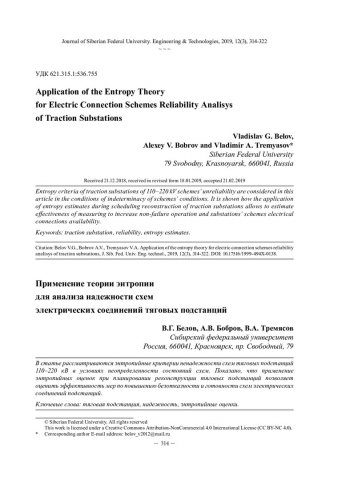 Библиографическое описание:Belov, Vladislav. Application of the Entropy Theory for Electric Connection Schemes Reliability Analisys of Traction Substations = Применение теории энтропии для анализа надежности схем электрических соединений тяговых подстанций / V. G. Belov, A. V. Bobrov, V. A. Tremyasov. - Текст : непосредственный // Журнал Сибирского федерального университета. Техника и технологии. - 2019. - Т. 12, № 3. - С. 314-322 : рис. - Библиогр.: с. 321-322. - ISSN 1999-494X.
