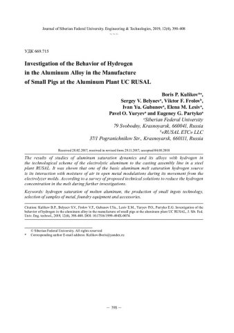 Библиографическое описание: Исследование поведения водорода в алюминиевом сплаве при производстве мелкой чушки на алюминиевом заводе ОК РУСАЛ = Investigation of the Behavior of Hydrogen in the Aluminum Alloy in the Manufacture of Small Pigs at the Aluminum Plant UC RUSAL / Б. П. Куликов [и др.]. - Текст : непосредственный // Журнал Сибирского федерального университета. Техника и технологии. - 2019. - Т. 12, № 4. - С. 398-408 : рис. - Библиогр.: с. 407-408. - ISSN 1999-494X.