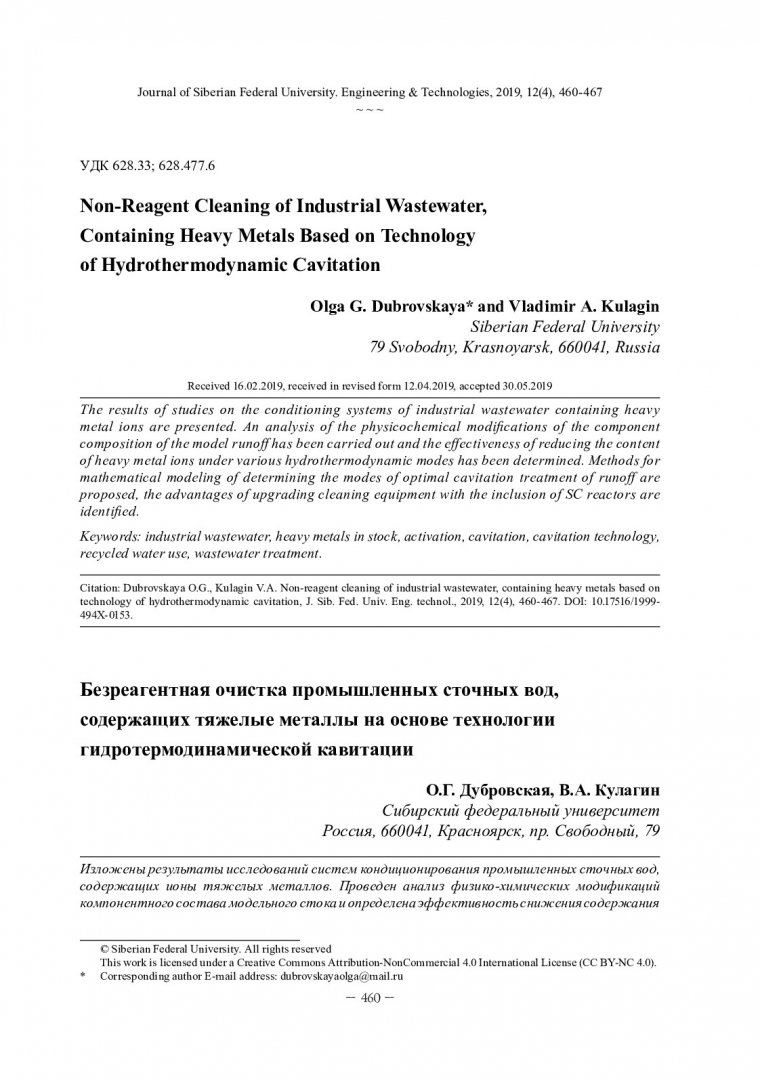 Библиографическое описание:Дубровская, О. Г. Безреагентная очистка промышленных сточных вод, содержащих тяжелые металлы на основе технологии гидротермодинамической кавитации = Non-Reagent Cleaning of Industrial Wastewater, Containing Heavy Metals Based on Technology of Hydrothermodynamic Cavitation / О. Г. Дубровская, В. А. Кулагин. - Текст : непосредственный // Журнал Сибирского федерального университета. Техника и технологии. - 2019. - Т. 12, № 4. - С. 460-467 : рис. - Библиогр.: с. 466-467. - ISSN 1999-494X.