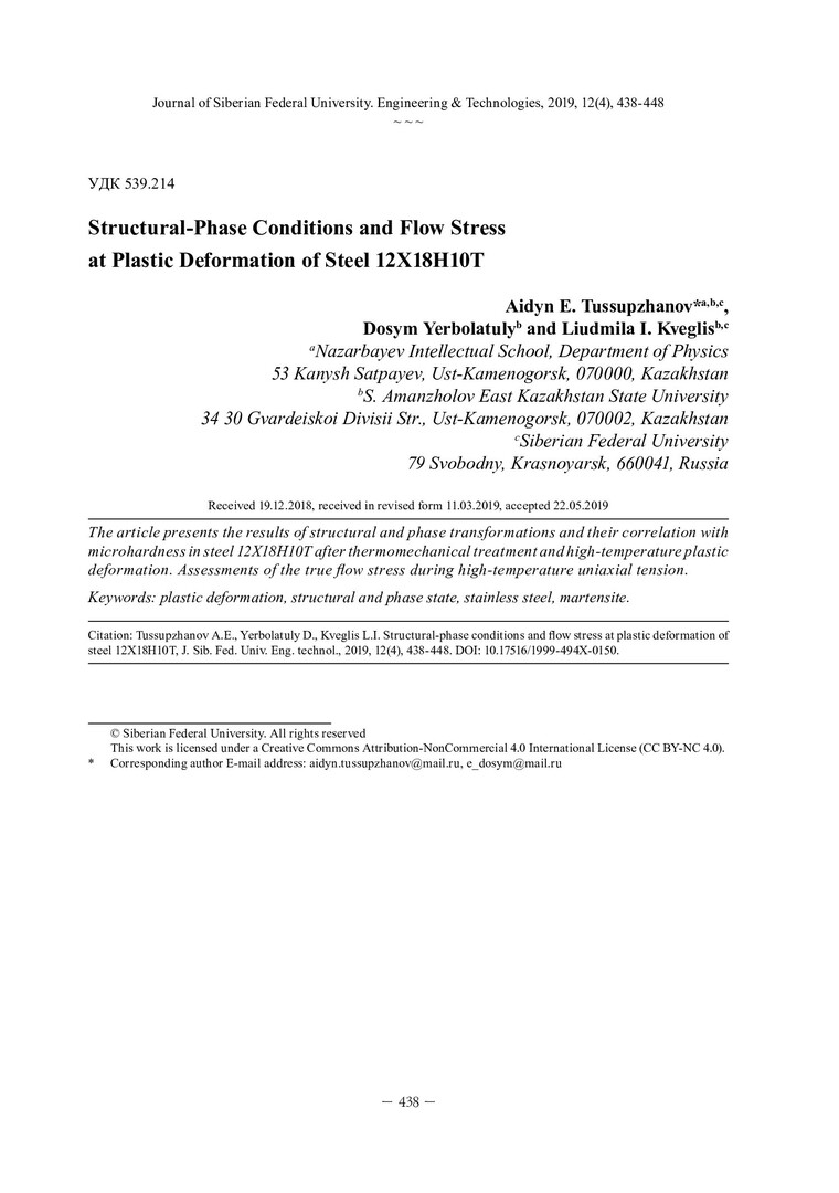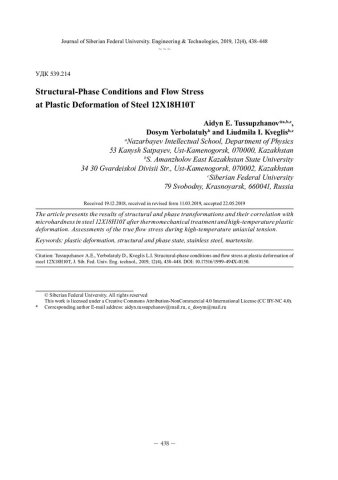 Библиографическое описание:Тусупжанов, А. Е. Структурно-фазовые состояния и напряжение течения при пластической деформации стали 12Х18Н10Т = Structural-Phase Conditions and Flow Stress at Plastic Deformation of Steel 12Х18Н10Т / А. Е. Тусупжанов, Д. Ерболатулы, Л. И. Квеглис. - Текст : непосредственный // Журнал Сибирского федерального университета. Техника и технологии. - 2019. - Т. 12, № 4. - С. 438-448 : рис. - Библиогр.: с. 446-448. - ISSN 1999-494X.