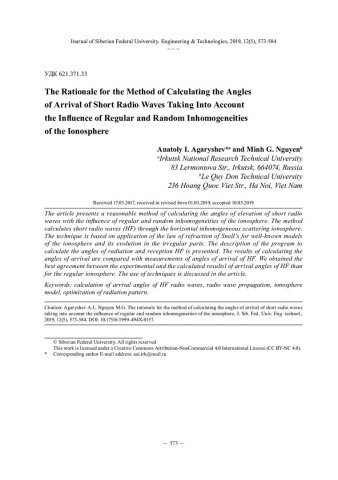 Библиографическое описание:Agaryshev, Anatoly. The Rationale for the Method of Calculating the Angles of Arrival of Short Radio Waves Taking Into Account the Influence of Regular and Random Inhomogeneities of the Ionosphere = Обоснование методики расчета углов прихода коротких радиоволн с учетом влияния регулярной и случайной неоднородности ионосферы / A. I. Agaryshev, M. G. Nguyen. - Текст : непосредственный // Журнал Сибирского федерального университета. Техника и технологии. - 2019. - Т. 12, № 5. - С. 573-584 : рис. - Библиогр.: с. 583-584. - ISSN 1999-494X.