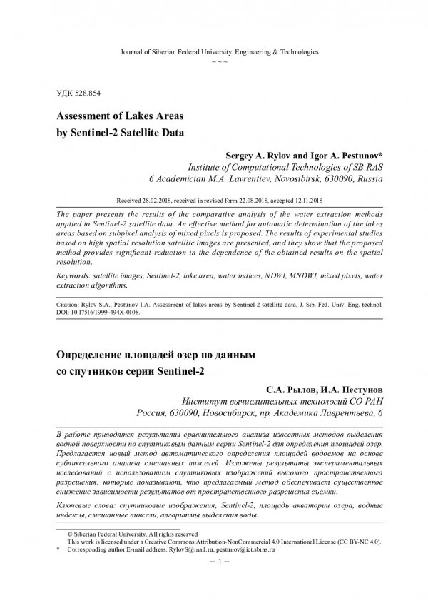Библиографическое описание: Рылов, С. А. Определение площадей озер по данным со спутников серии Sentinel-2 = Assessment of Lakes Areas by Sentinel-2 Satellite Data / С. А. Рылов, И. А. Пестунов. - Текст : непосредственный // Журнал Сибирского федерального университета. Техника и технологии. - 2019. - Т. 12, № 5. - С. 526-535 : рис. - Библиогр.: с. 533-535. - ISSN 1999-494X.