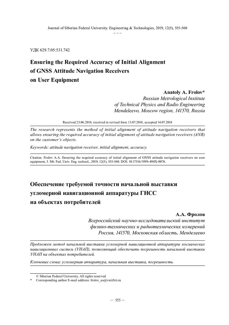 Библиографическое описание:Frolov, Anatoly. Ensuring the Required Accuracy of Initial Alignment of Gnss Attitude Navigation Receivers on User Equipment = Обеспечение требуемой точности начальной выставки угломерной навигационной аппаратуры ГНСС на объектах потребителей / A. A. Frolov. - Текст : непосредственный // Журнал Сибирского федерального университета. Техника и технологии. - 2019. - Т. 12, № 5. - С. 555-560 : рис. - Библиогр.: с. 559-560. - ISSN 1999-494X.
