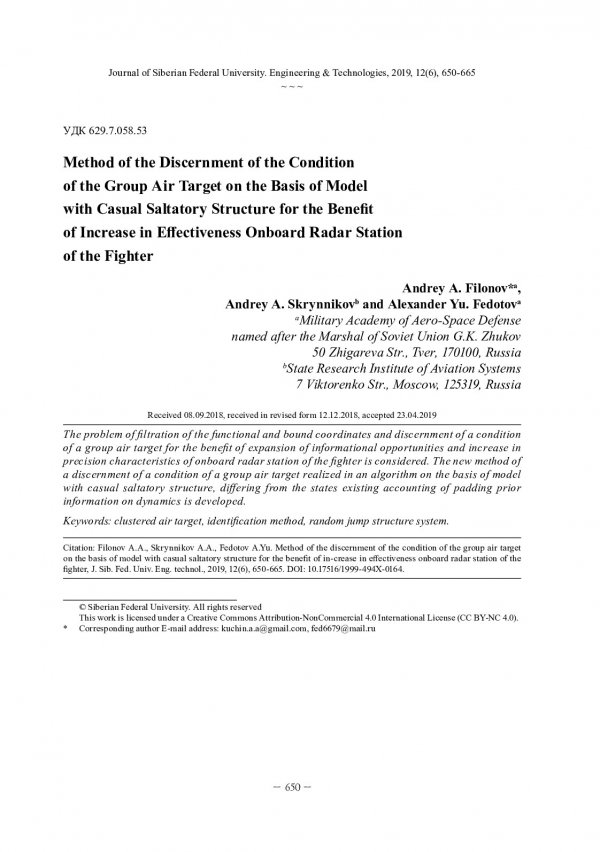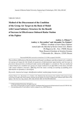 Библиографическое описание:Филонов, А. А. Метод распознавания состояния групповой воздушной цели на основе модели со случайной скачкообразной структурой в интересах повышения эффективности бортовой радиолокационной станции истребителя = Method of the Discernment of the Condition of the Group Air Target on the Basis of Model with Casual Saltatory Structure for the Benefit of Increase in Effectiveness Onboard Radar Station of the Fighter / А. А. Филонов, А. А. Скрынников, А. Ю. Федотов. - Текст : непосредственный // Журнал Сибирского федерального университета. Техника и технологии. - 2019. - Т. 12, № 6. - С. 650-665 : рис. - Библиогр.: с. 664-665. - ISSN 1999-494X.