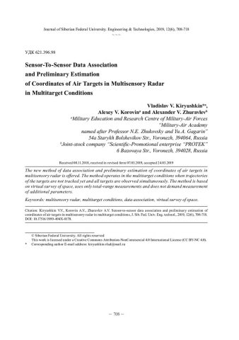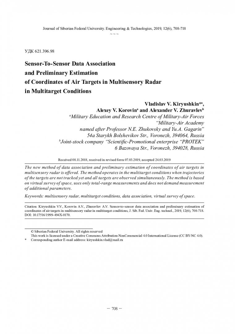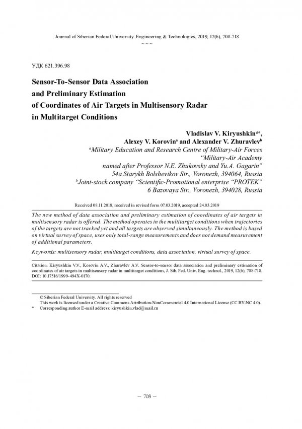 Библиографическое описание:Кирюшкин, В. В. Межпозиционное отождествление результатов измерений и определение координат воздушных целей в многопозиционной радиолокационной системе в условиях многоцелевой обстановки = Sensor-To-Sensor Data Association and Preliminary Estimation of Coordinates of Air Targets in Multisensory Radar in Multitarget Conditions / В. В. Кирюшкин, А. В. Коровин, А. В. Журавлев. - Текст : непосредственный // Журнал Сибирского федерального университета. Техника и технологии. - 2019. - Т. 12, № 6. - С. 708-718 : рис. - Библиогр.: с. 718. - ISSN 1999-494X.