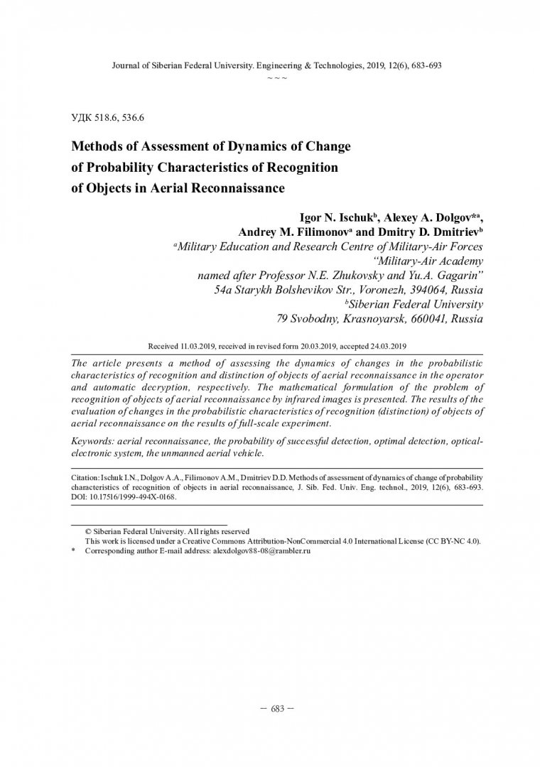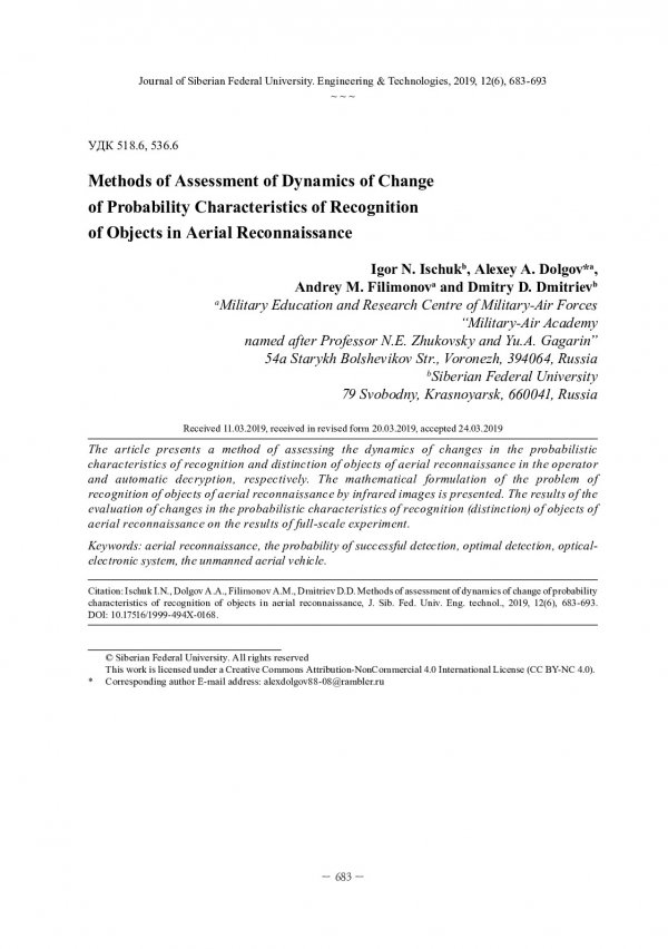Аннотация:В статье представлена методика оценки динамики изменения вероятностных характеристик распознавания и различения объектов воздушной разведки при операторном и автоматическом дешифрировании соответственно. Представлена математическая постановка задачи распознавания объектов воздушной разведки по инфракрасным изображениям. Приведены результаты оценки изменения вероятностных характеристик распознавания (различения) объектов воздушной разведки по результатам натурного эксперимента.