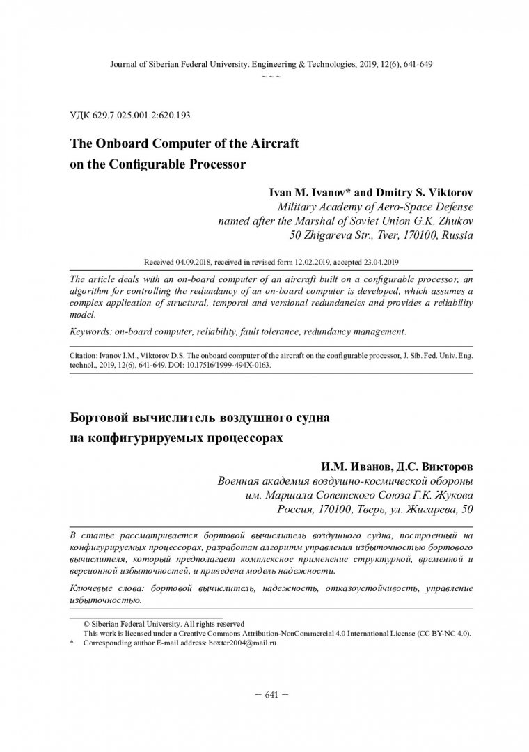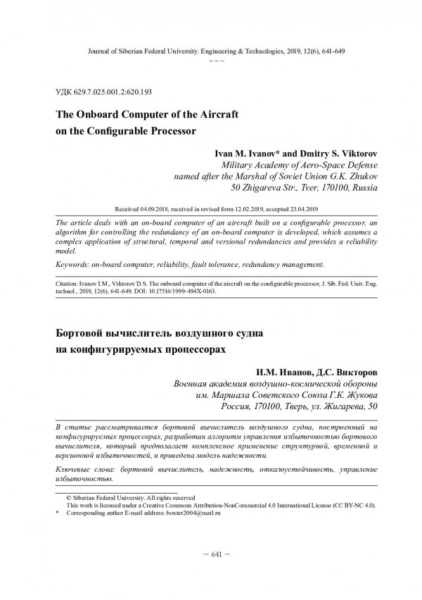Библиографическое описание:Иванов, И. М. Бортовой вычислитель воздушного судна на конфигурируемых процессорах = The Onboard Computer of the Aircraft on the Configurable Processor / И. М. Иванов, Д. С. Викторов. - Текст : непосредственный // Журнал Сибирского федерального университета. Техника и технологии. - 2019. - Т. 12, № 6. - С. 641-649 : рис. - Библиогр.: с. 649. - ISSN 1999-494X.