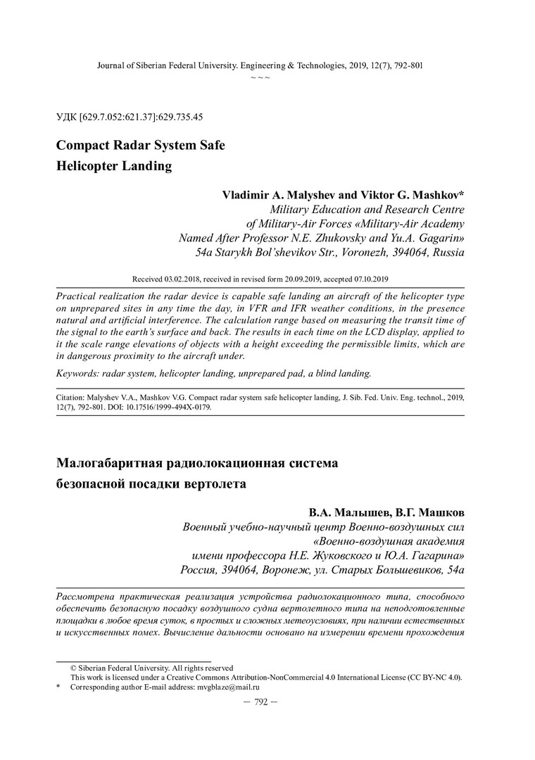 Библиографическое описание: Malyshev, Vladimir. Compact Radar System Safe Helicopter Landing = Малогабаритная радиолокационная система безопасной посадки вертолета / V. A. Malyshev, V. G. Mashkov. - Текст : непосредственный // Журнал Сибирского федерального университета. Техника и технологии. - 2019. - Т. 12, № 7. - С. 792-801 : рис. - Библиогр.: с. 801. - ISSN 1999-494X.