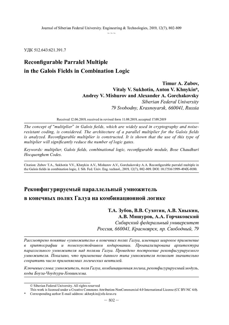 Библиографическое описание:Реконфигурируемый параллельный умножитель в конечных полях Галуа на комбинационной логике = Reconfigurable Parralel Multiple in the Galois Fields in Combination Logic / Т. А. Зубов [и др.]. - Текст : непосредственный // Журнал Сибирского федерального университета. Техника и технологии. - 2019. - Т. 12, № 7. - С. 802-809 : рис. - Библиогр.: с. 809. - ISSN 1999-494X.