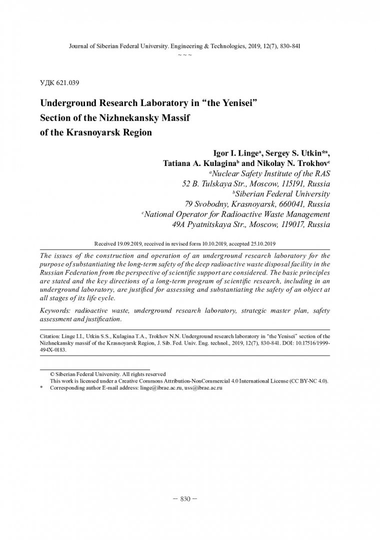 Библиографическое описание:Подземная исследовательская лаборатория на участке «Енисейский» Нижнеканского массива Красноярского края = Underground Research Laboratory in “the Yenisei” Section of the Nizhnekansky Massif of the Krasnoyarsk Region / И. И. Линге [и др.]. - Текст : непосредственный // Журнал Сибирского федерального университета. Техника и технологии. - 2019. - Т. 12, № 7. - С. 830-841 : рис. - Библиогр.: с. 837-841. - ISSN 1999-494X.