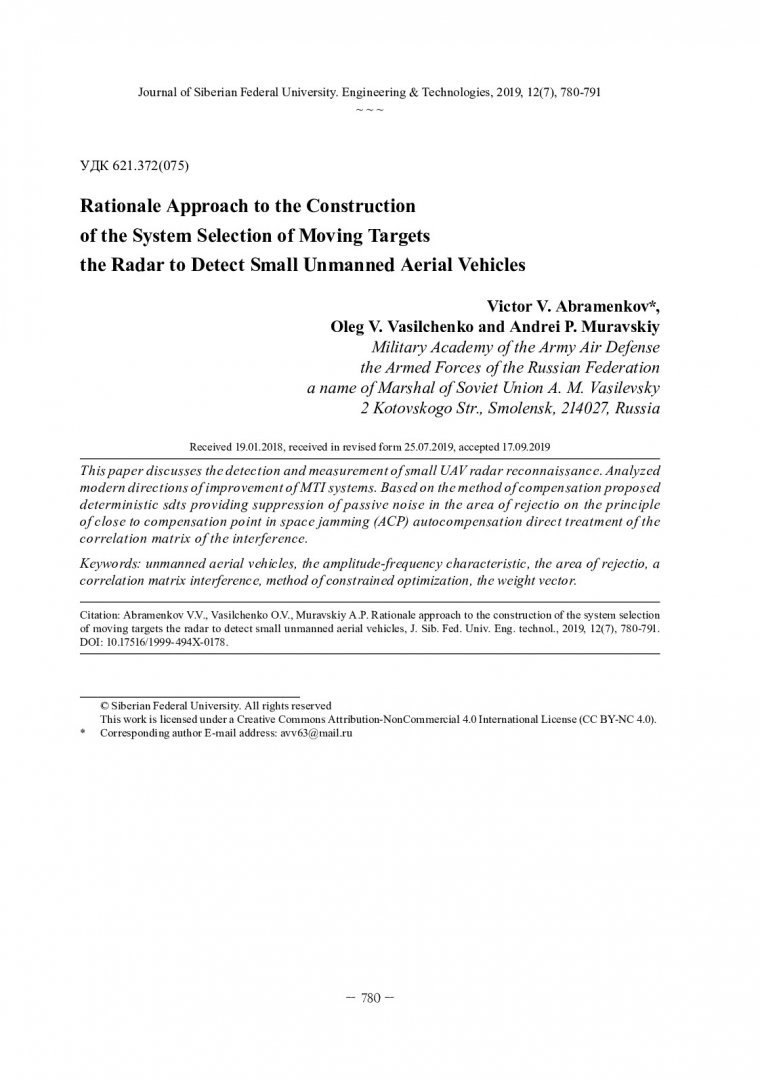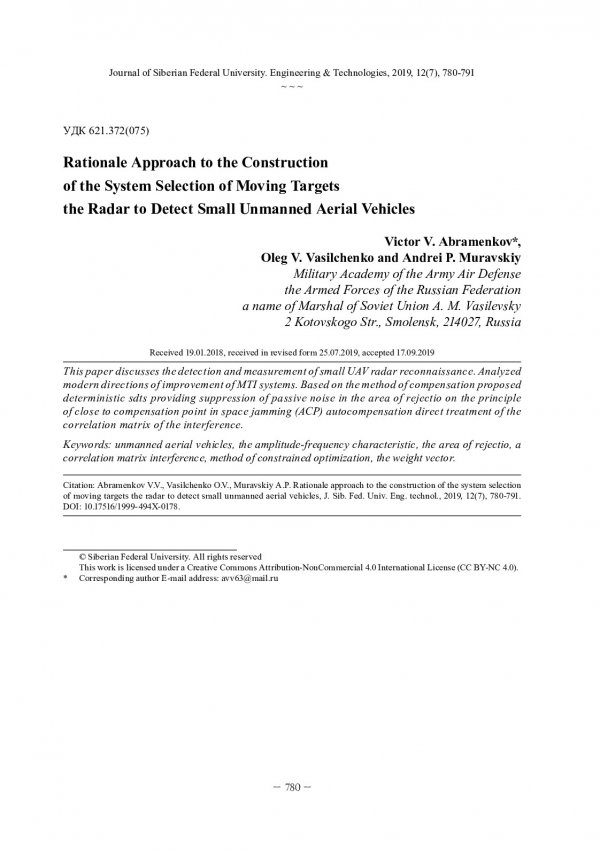 Библиографическое описание:Абраменков, В. В. Обоснование подхода к построению системы селекции движущихся целей радиолокационной станции обнаружения малоразмерных беспилотных летательных аппаратов = Rationale Approach to the Construction of the System Selection of Moving Targets the Radar to Detect Small Unmanned Aerial Vehicles / В. В. Абраменков, О. В. Васильченко, А. П. Муравский. - Текст : непосредственный // Журнал Сибирского федерального университета. Техника и технологии. - 2019. - Т. 12, № 7. - С. 780-791 : рис. - Библиогр.: с. 791. - ISSN 1999-494X.