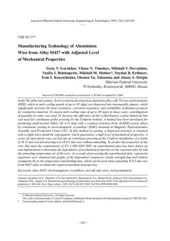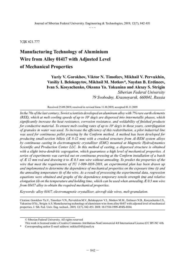 Библиографическое описание: Технология изготовления проволоки из сплава 01417 с заданным уровнем механических свойств = Manufacturing Technology of Aluminium Wire from Alloy 01417 with Adjusted Level of Mechanical Properties / Ю. В. Горохов [и др.]. - Текст : непосредственный // Журнал Сибирского федерального университета. Техника и технологии. - 2019. - Т. 12, № 7. - С. 842-851 : рис. - Библиогр.: с. 850-851. - ISSN 1999-494X.