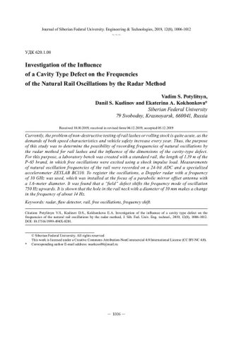 Библиографическое описание: Потылицын, В. С. Исследование влияния дефекта типа полости на частоты свободных колебаний рельсов радиолокационным методом = Investigation of the Influence of a Cavity Type Defect on the Frequencies of the Natural Rail Oscillations by the Radar Method / В. С. Потылицын, Д. С. Кудинов, Е. А. Кохонькова. - Текст : непосредственный // Журнал Сибирского федерального университета. Техника и технологии. - 2019. - Т. 12, № 8. - С. 1006-1012 : рис. - Библиогр.: с. 1012. - ISSN 1999-494X.