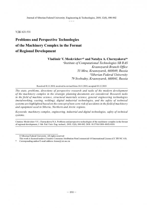 Библиографическое описание:Москвичев, В. В. Проблемы и перспективные технологии машиностроительного комплекса в формате регионального развития = Problems and Perspective Technologies of the Machinery Complex in the Format of Regional Development / В. В. Москвичев, Н. А. Чернякова. - Текст : непосредственный // Журнал Сибирского федерального университета. Техника и технологии. - 2019. - Т. 12, № 8. - С. 890-902 : рис. - Библиогр.: с. 901-902. - ISSN 1999-494X.