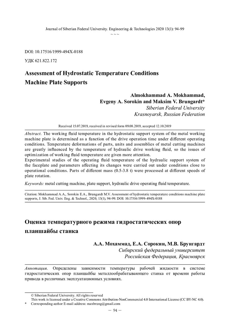 Библиографическое описание: Мохаммад, А. А. Оценка температурного режима гидростатических опор планшайбы станка / А. А. Мохаммад, Е. А. Сорокин, М. В. Брунгардт. - Текст : непосредственный // Журнал Сибирского федерального университета. Техника и технологии. - 2020. - Т. 13, № 1. - С. 94-99 : рис. - Библиогр.: с. 99. - ISSN 1999-494X.