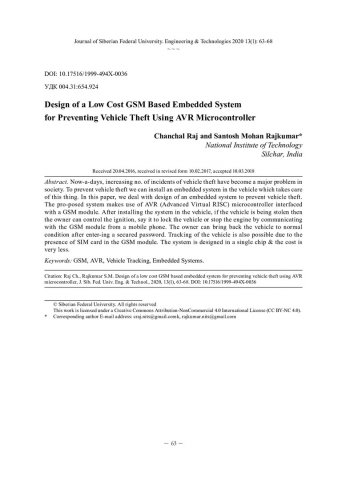 Библиографическое описание: Raj, Chanchal. Design of a Low Cost GSM Based Embedded System for Preventing Vehicle Theft Using AVR Microcontroller = Дизайн низкой стоимости GSM на основе встроенных систем для предотвращения кражи транспортных средств с использованием микроконтроллеров AVR / C. Raj, S. M. Rajkumar. - Текст : непосредственный // Журнал Сибирского федерального университета. Техника и технологии. - 2020. - Т. 13, № 1. - С. 63-68 : рис. - Библиогр.: с. 68. - ISSN 1999-494X.