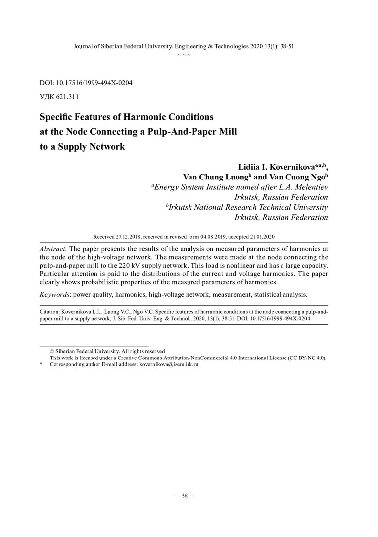 Библиографическое описание:Kovernikova, Lidiia I... Specific Features of Harmonic Conditions at the Node Connecting a Pulp-And-Paper Mill to a Supply Network = Особенности параметров режимов гармоник в узле присоединения целлюлозно-бумажного комбината к питающей сети / L. I. Kovernikova, V. C. Luong, V. C. Ngo. - Текст : непосредственный // Журнал Сибирского федерального университета. Техника и технологии. - 2020. - Т. 13, № 1. - С. 38-51 : рис. - Библиогр.: с. 50-51. - ISSN 1999-494X.