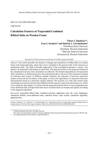 Библиографическое описание: Zhadanov, Viktor I... Calculation Features of Trapezoidal Combined Ribbed Slabs on Wooden Frame = Особенности расчета трапециевидных совмещенных ребристых плит на деревянном каркасе / V. I. Zhadanov, I. S. Inzhutov, D. A. Ukrainchenko. - Текст : непосредственный // Журнал Сибирского федерального университета. Техника и технологии. - 2020. - Т. 13, № 1. - С. 100-110 : рис. - Библиогр.: с. 109-110. - ISSN 1999-494X.