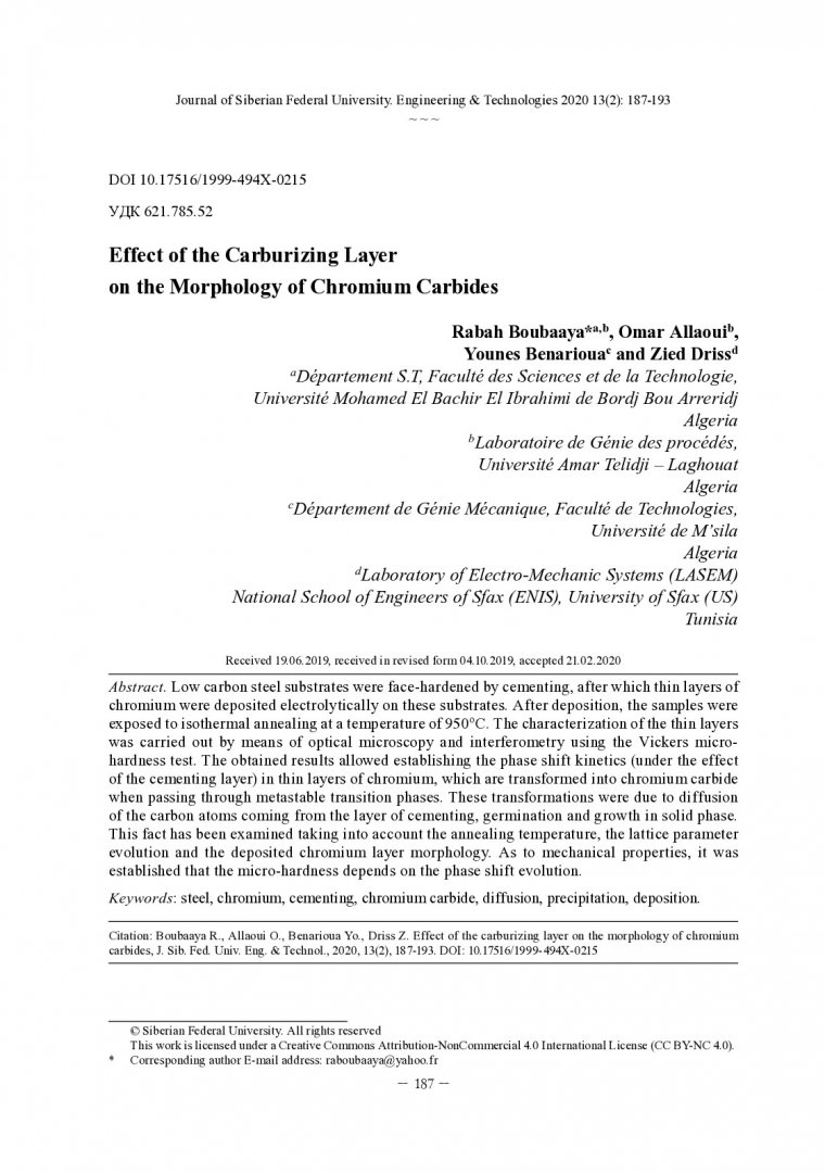 Библиографическое описание: Effect of the Carburizing Layer on the Morphology of Chromium Carbides = Влияние углеродного слоя на морфологию карбидов хрома / R. Boubaaya, O. Allaoui, Y. Benarioua, Z. Driss. - Текст : непосредственный // Журнал Сибирского федерального университета. Техника и технологии. - 2020. - Т. 13, № 2. - С. 187-193 : рис. - Библиогр.: с. 192-193. - ISSN 1999-494X.
