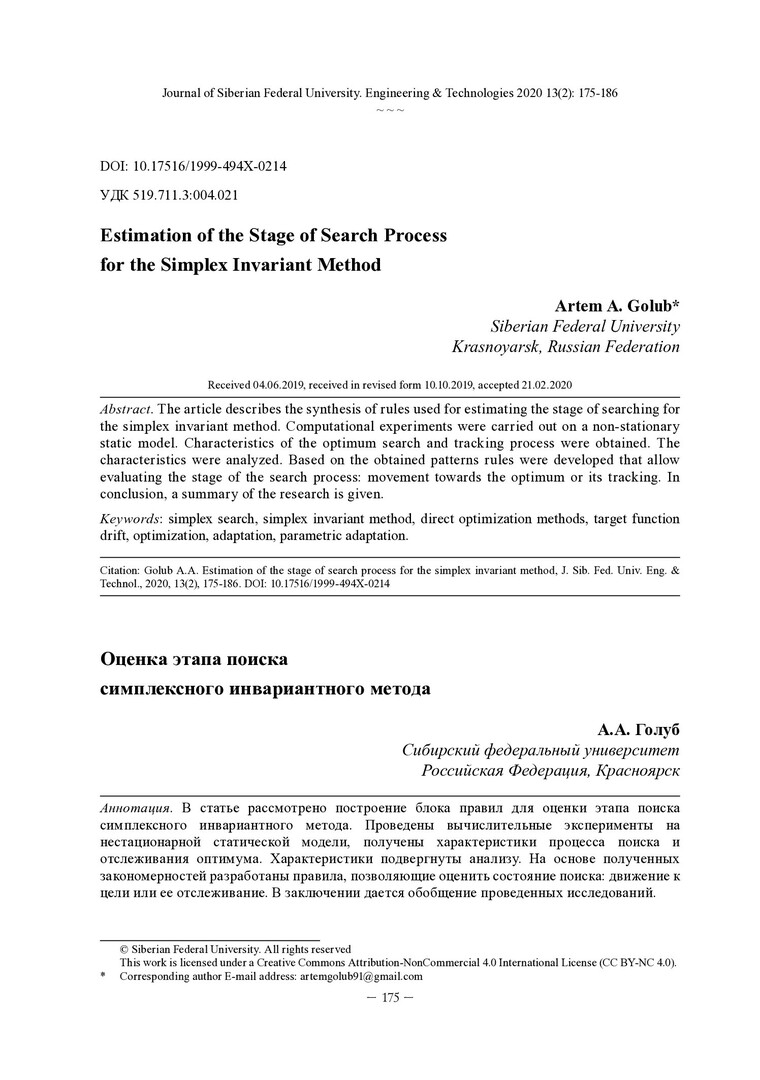 Библиографическое описание:Голуб, А. А. Оценка этапа поиска симплексного инвариантного метода / А. А. Голуб. - Текст : непосредственный // Журнал Сибирского федерального университета. Техника и технологии. - 2020. - Т. 13, № 2. - С. 175-186 : рис. - Библиогр.: с. 186. - ISSN 1999-494X.