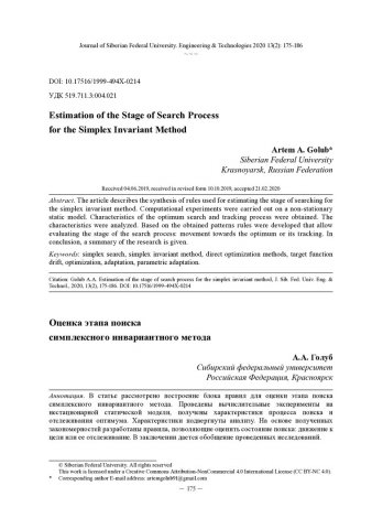 Аннотация:В статье рассмотрено построение блока правил для оценки этапа поиска симплексного инвариантного метода. Проведены вычислительные эксперименты на нестационарной статической модели, получены характеристики процесса поиска и отслеживания оптимума. Характеристики подвергнуты анализу. На основе полученных закономерностей разработаны правила, позволяющие оценить состояние поиска: движение к цели или ее отслеживание. В заключении дается обобщение проведенных исследований.