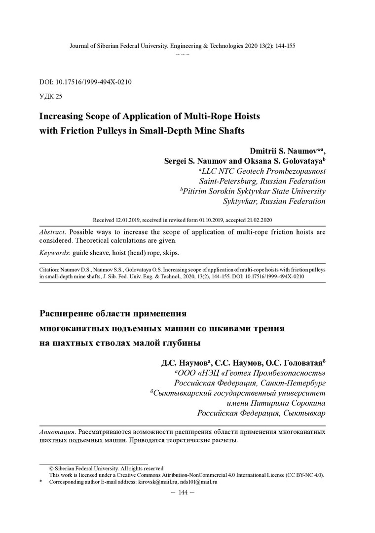 Библиографическое описание:Naumov, Dmitrii S... Increasing Scope of Application of Multi-Rope Hoists with Friction Pulleys in Small-Depth Mine Shafts = Расширение области применения многоканатных подъемных машин со шкивами трения на шахтных стволах малой глубины / D. S. Naumov, S. S. Naumov, O. S. Golovataya. - Текст : непосредственный // Журнал Сибирского федерального университета. Техника и технологии. - 2020. - Т. 13, № 2. - С. 144-155 : рис. - Библиогр.: с. 154-155. - ISSN 1999-494X.