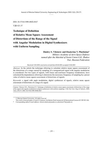 Библиографическое описание:Викторов, Д. С. Методика определения относительной среднеквадратической оценки искажений спектра сигнала с угловой модуляцией в цифровых синтезаторах с равномерной дискретизацией / Д. С. Викторов, Е. В. Пластинина. - Текст : непосредственный // Журнал Сибирского федерального университета. Техника и технологии. - 2020. - Т. 13, № 3. - С. 259-271 : рис. - Библиогр.: с. 271. - ISSN 1999-494X.