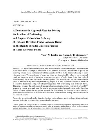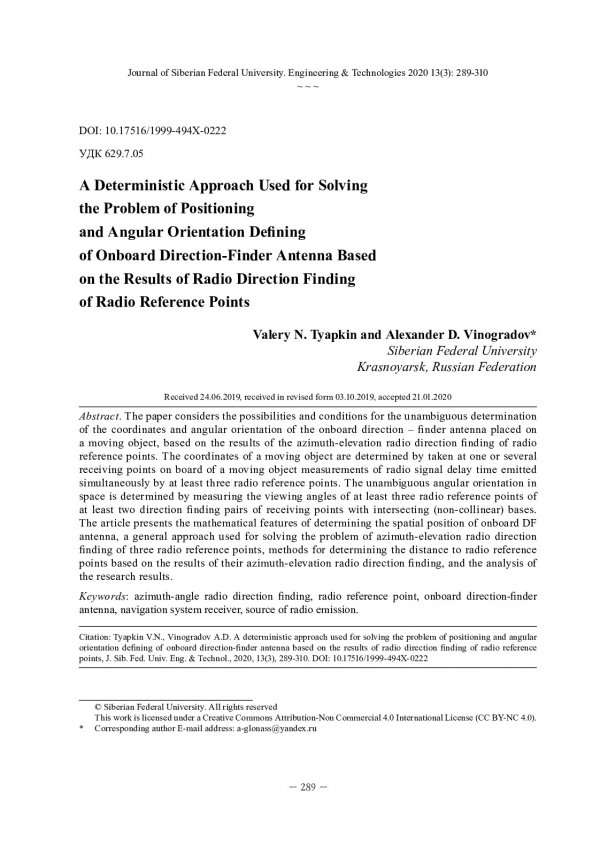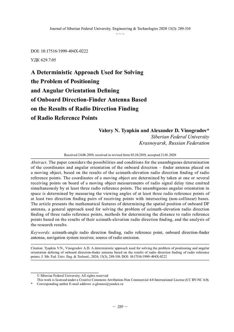 Библиографическое описание:Тяпкин, В. Н. Детерминированный подход к решению задачи определения координат и угловой ориентации бортовой пеленгаторной антенны по результатам радиопеленгования радиоориентиров / В. Н. Тяпкин, А. Д. Виноградов. - Текст : непосредственный // Журнал Сибирского федерального университета. Техника и технологии. - 2020. - Т. 13, № 3. - С. 289-310 : рис. - Библиогр.: с. 309-310. - ISSN 1999-494X.