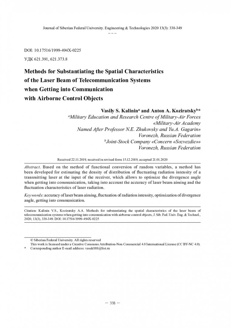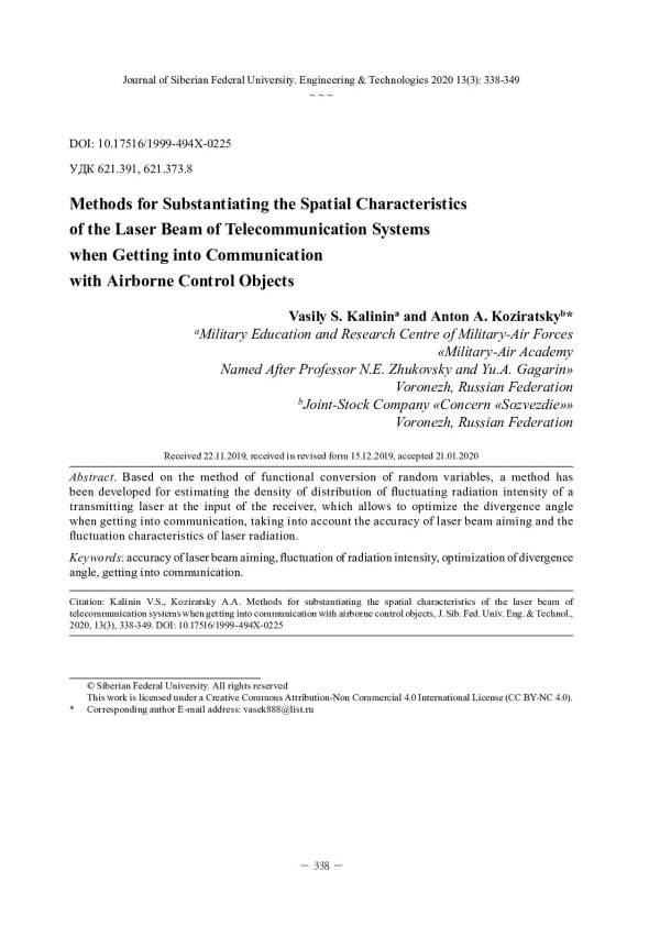 Библиографическое описание:Калинин, В. С. Методика обоснования пространственных характеристик лазерного луча систем телекоммуникации при вхождении в связь с воздушными объектами управления / В. С. Калинин, А. А. Козирацкий. - Текст : непосредственный // Журнал Сибирского федерального университета. Техника и технологии. - 2020. - Т. 13, № 3. - С. 338-349 : рис. - Библиогр.: с. 348-349. - ISSN 1999-494X.