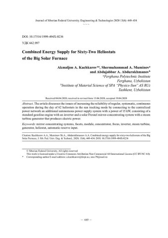Библиографическое описание: Kuchkarov, Akmaljon A... Combined Energy Supply for Sixty-Two Heliostats of the Big Solar Furnace = Комбинированное энергообеспечение 62 гелиостатов Большой Солнечной Печи / A. A. Kuchkarov, S. A. Muminov, A. A. Abdurakhmanov. - Текст : непосредственный // Журнал Сибирского федерального университета. Техника и технологии. - 2020. - Т. 13, № 4. - С. 449-454 : рис. - Библиогр.: с. 454. - ISSN 1999-494X.