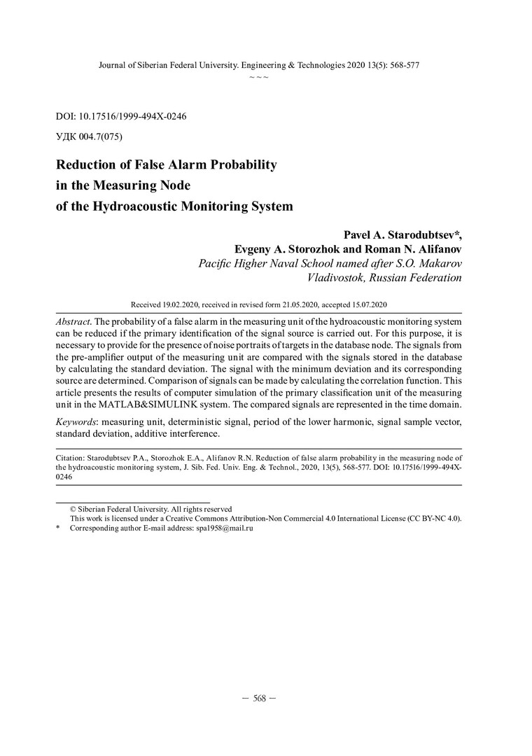Библиографическое описание:Стародубцев, П. А. Снижение вероятности ложной тревоги в измерительном узле системы гидроакустического мониторинга / П. А. Стародубцев, Е. А. Сторожок, Р. Н. Алифанов. - Текст : непосредственный // Журнал Сибирского федерального университета. Техника и технологии. - 2020. - Т. 13, № 5. - С. 568-577 : рис. - Библиогр.: с. 577. - ISSN 1999-494X.