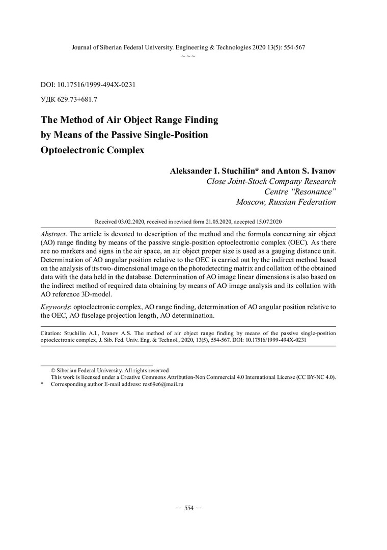 Библиографическое описание: Стучилин, А. И. Метод определения дальности воздушного объекта пассивным однопозиционным оптико-электронным комплексом / А. И. Стучилин, А. С. Иванов. - Текст : непосредственный // Журнал Сибирского федерального университета. Техника и технологии. - 2020. - Т. 13, № 5. - С. 554-567 : рис. - Библиогр.: с. 565-567. - ISSN 1999-494X.
