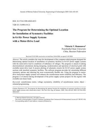 Библиографическое описание:Romanova, V. V. The Program for Determining the Optimal Location for Installation of Symmetry Facilities in 0.4 Kv Power Supply Systems with a Motor-Drive Load = Программа определения оптимального места установки средств симметрирования в системах электроснабжения 0,4 кВ с электродвигательной нагрузкой / V. V. Romanova. - Текст : непосредственный // Журнал Сибирского федерального университета. Техника и технологии. - 2020. - Т. 13, № 5. - С. 643-651 : рис. - Библиогр.: с. 650-651. - ISSN 1999-494X.