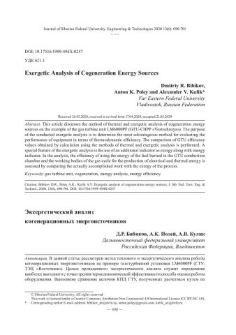 Библиографическое описание: Бибиков, Д. Р. Эксергетический анализ когенерационных энергоисточников / Д. Р. Бибиков, А. К. Полей, А. В. Кулик. - Текст : непосредственный // Журнал Сибирского федерального университета. Техника и технологии. - 2020. - Т. 13, № 6. - С. 690-701 : рис. - Библиогр.: с. 700-701. - ISSN 1999-494X.
