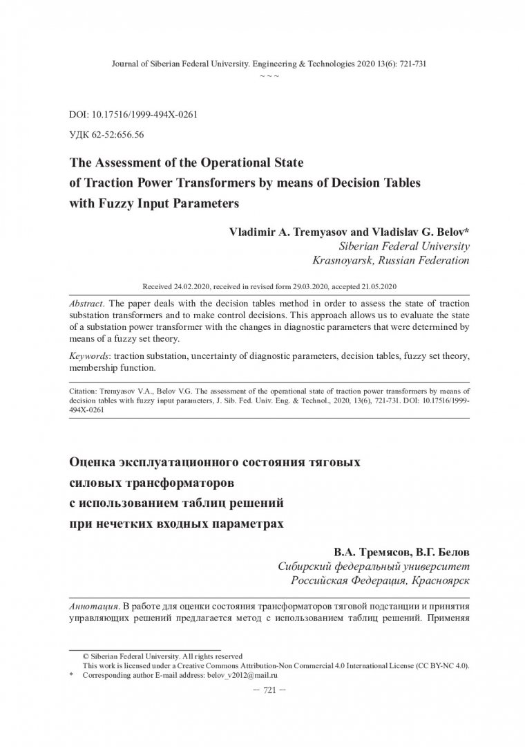 Библиографическое описание:Тремясов, В. А. Оценка эксплуатационного состояния тяговых силовых трансформаторов с использованием таблиц решений при нечетких входных параметрах / В. А. Тремясов, В. Г. Белов. - Текст : непосредственный // Журнал Сибирского федерального университета. Техника и технологии. - 2020. - Т. 13, № 6. - С. 721-731 : рис. - Библиогр.: с. 730-731. - ISSN 1999-494X.