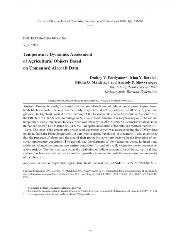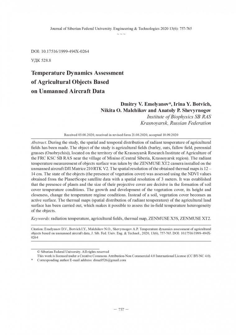 Библиографическое описание: Оценка динамики температур сельскохозяйственных объектов по данным беспилотных воздушных судов / Д. В. Емельянов, И. Ю. Ботвич, Н. О. Мальчиков, А. П. Шевырногов. - Текст : непосредственный // Журнал Сибирского федерального университета. Техника и технологии. - 2020. - Т. 13, № 6. - С. 757-765 : рис. - Библиогр.: с. 765. - ISSN 1999-494X.