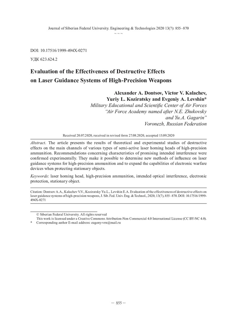 Библиографическое описание:Оценка эффективности деструктивных воздействий на лазерные системы наведения высокоточного оружия / А. А. Донцов, В. В. Калачев, Ю. Л. Козирацкий, Е. А. Левшин. - Текст : непосредственный // Журнал Сибирского федерального университета. Техника и технологии. - 2020. - Т. 13, № 7. - С. 855-870 : рис. - Библиогр.: с. 869-870. - ISSN 1999-494X.