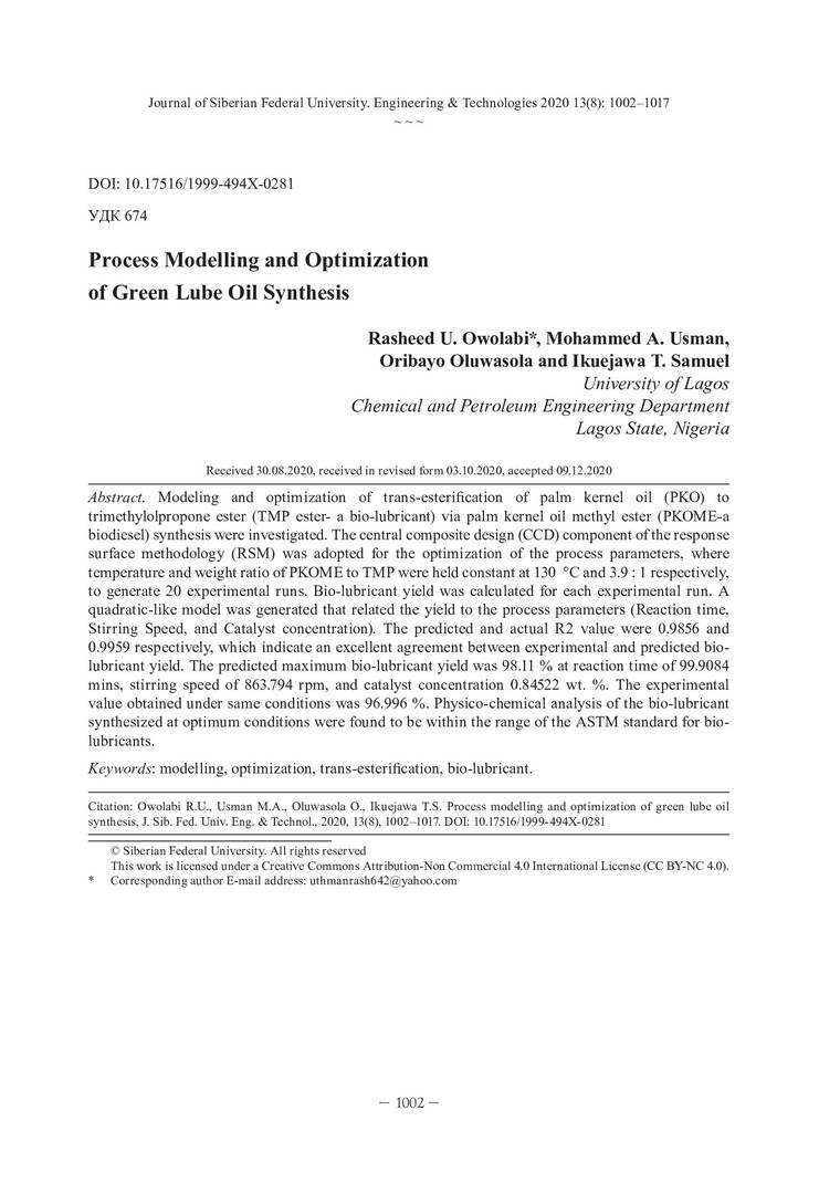 Библиографическое описание: Process Modelling and Optimization of Green Lube Oil Synthesis = Моделирование процесса и оптимизация синтеза зеленого смазочного масла / R. U. Owolabi, M. A. Usman, O Oluwasola, I. T. Samuel. - Текст : непосредственный // Журнал Сибирского федерального университета. Техника и технологии. - 2020. - Т. 13, № 8. - С. 1002-1017 : рис. - Библиогр.: с. 1013-1017. - ISSN 1999-494X.