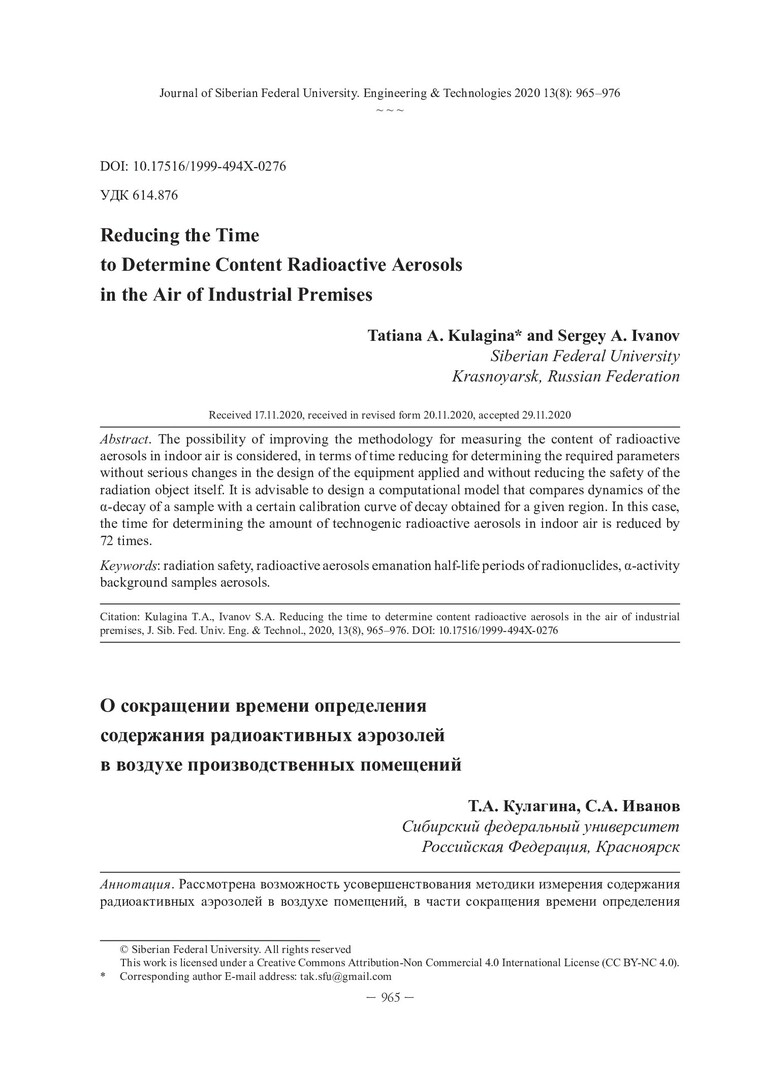 Библиографическое описание:Кулагина, Т. А. О сокращении времени определения содержания радиоактивных аэрозолей в воздухе производственных помещений / Т. А. Кулагина, С. А. Иванов. - Текст : непосредственный // Журнал Сибирского федерального университета. Техника и технологии. - 2020. - Т. 13, № 8. - С. 965-976 : рис. - Библиогр.: с. 973-976. - ISSN 1999-494X.