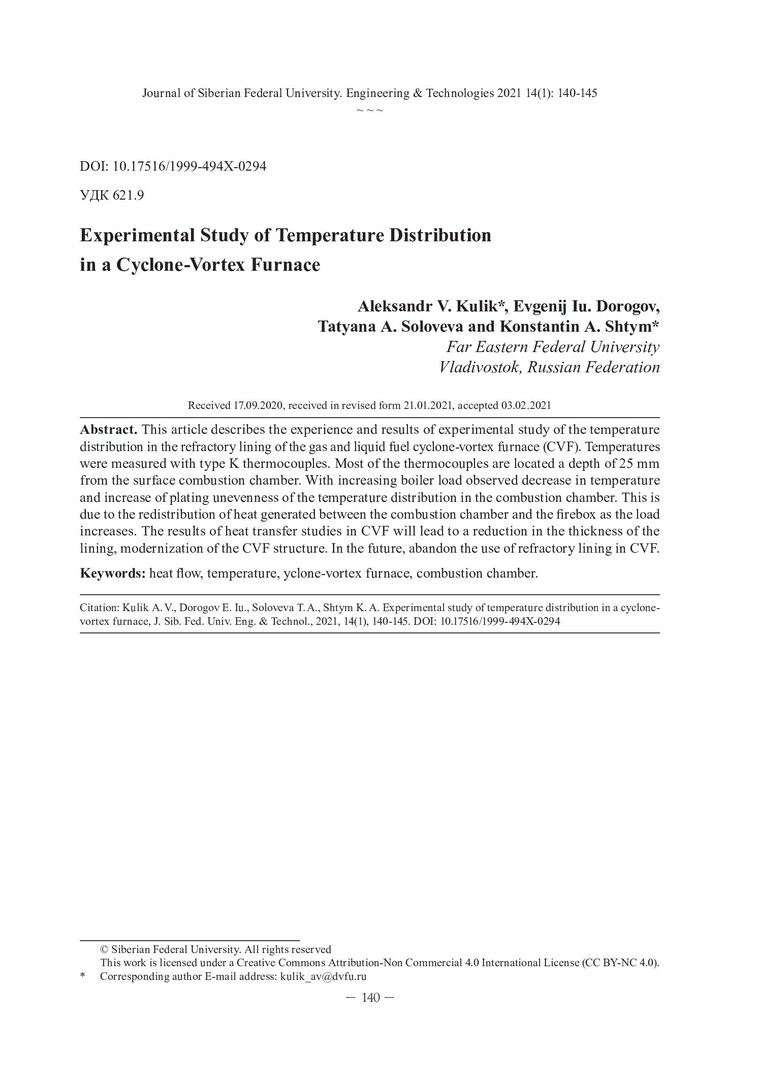 Библиографическое описание: Experimental Study of Temperature Distribution in a Cyclone-Vortex Furnace = Экспериментальное исследование распределения температур в циклонно-вихревом предтопке / A. V. Kulik, E. Iu. Dorogov, T. A. Soloveva, K. A. Shtym. - Текст : непосредственный // Журнал Сибирского федерального университета. Техника и технологии. - 2021. - Т. 14, № 1. - С. 140-145 : рис. - Библиогр.: с. 145. - ISSN 1999-494X.