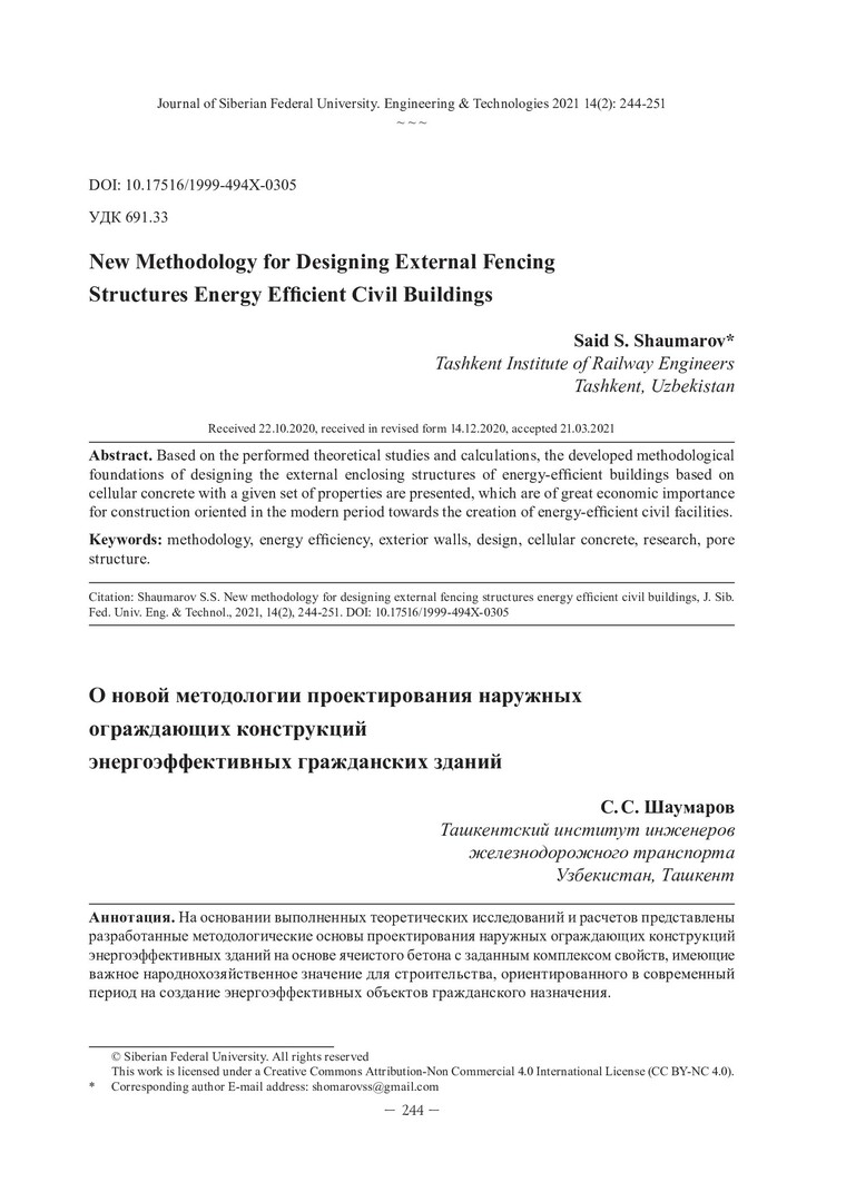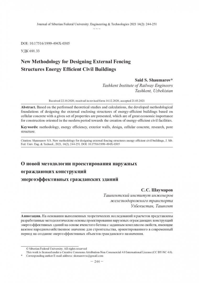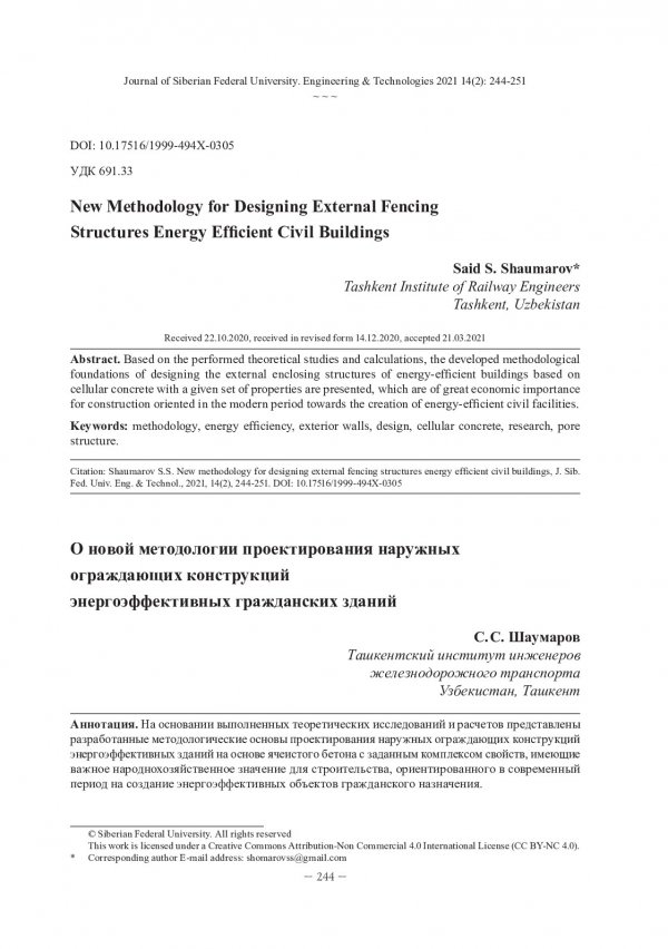 Библиографическое описание:Shaumarov, Said S... New Methodology for Designing External Fencing Structures Energy Efficient Civil Buildings = О новой методологии проектирования наружных ограждающих конструкций энергоэффективных гражданских зданий / S. S. Shaumarov. - Текст : непосредственный // Журнал Сибирского федерального университета. Техника и технологии. - 2021. - Т. 14, № 2. - С. 244-251. - Библиогр.: с. 249-251. - ISSN 1999-494X.