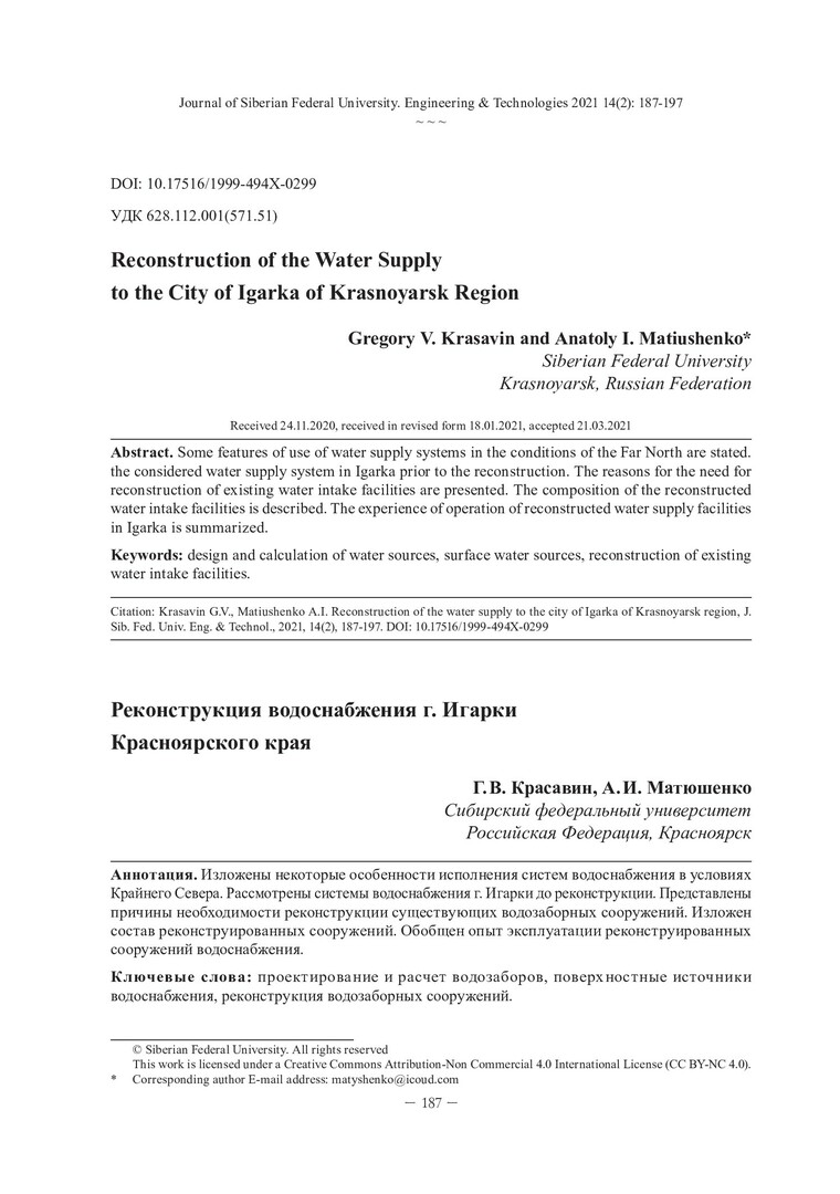 Библиографическое описание:Красавин, Г. В. Реконструкция водоснабжения г. Игарки Красноярского края = Reconstruction of the Water Supply to the City of Igarka of Krasnoyarsk Region / Г. В. Красавин, А. И. Матюшенко. - Текст : непосредственный // Журнал Сибирского федерального университета. Техника и технологии. - 2021. - Т. 14, № 2. - С. 187-197. - Библиогр.: с. 195-197. - ISSN 1999-494X.