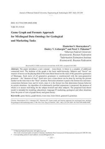 Библиографическое описание: Скорнякова, Е. С. Игровой граф и форматный подход для смешанно-языковой онтологии данных в задачах геологии и маркетинга = Game Graph and Formats Approach for Mixlingual Data Ontology for Geological and Marketing Tasks / Е. С. Скорнякова, Д. В. Личаргин, П. В. Полуян. - Текст : непосредственный // Журнал Сибирского федерального университета. Техника и технологии. - 2021. - Т. 14, № 2. - С. 252-259. - Библиогр.: с. 259. - ISSN 1999-494X.
