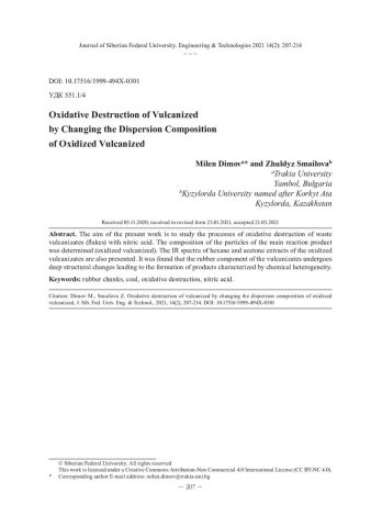 Библиографическое описание:Dimov, Milen. Oxidative Destruction of Vulcanized by Changing the Dispersion Composition of Oxidized Vulcanized = Окислительное разрушение вулканизатов при изменении дисперсионного состава окисленного вулканизата / M. Dimov, Zh. Smailova. - Текст : непосредственный // Журнал Сибирского федерального университета. Техника и технологии. - 2021. - Т. 14, № 2. - С. 207-214. - Библиогр.: с. 213-214. - ISSN 1999-494X.
