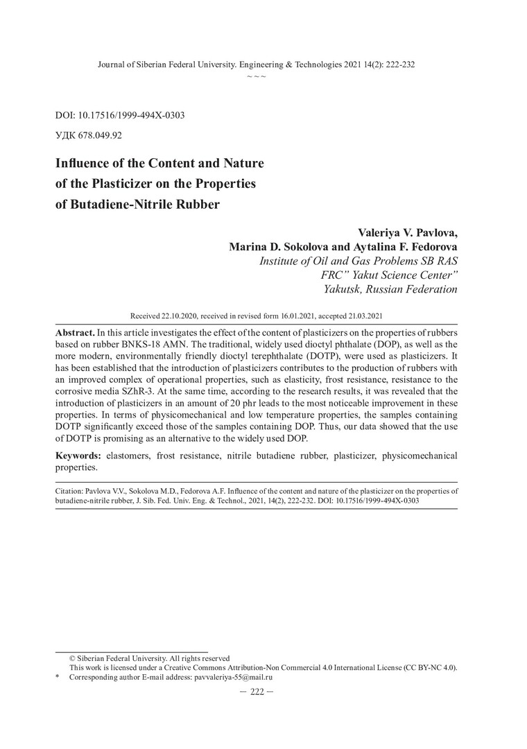 Библиографическое описание: Павлова, В. В. Влияние содержания и природы пластификатора на свойства бутадиен-нитрильной резины = Influence of the Content and Nature of the Plasticizer on the Properties of Butadiene-Nitrile Rubber / В. В. Павлова, М. Д. Соколова, А. Ф. Федорова. - Текст : непосредственный // Журнал Сибирского федерального университета. Техника и технологии. - 2021. - Т. 14, № 2. - С. 222-232. - Библиогр.: с. 230-232. - ISSN 1999-494X.