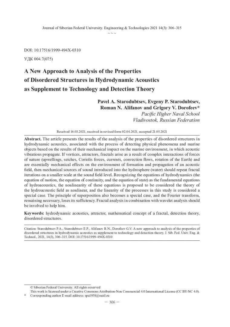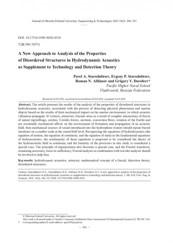 Библиографическое описание: Новый подход к анализу свойств неупорядоченных структур в гидродинамической акустике как дополнение в технологию и теорию обнаружения = A New Approach to Analysis of the Properties of Disordered Structures in Hydrodynamic Acoustics as Supplement to Technology and Detection Theory / П. А. Стародубцев, Е. П. Стародубцев, Р. Н. Алифанов, Г. В. Дорофеев. - Текст : непосредственный // Журнал Сибирского федерального университета. Техника и технологии. - 2021. - Т. 14, № 3. - С. 306-315. - Библиогр.: с. 314-315. - ISSN 1999-494X.